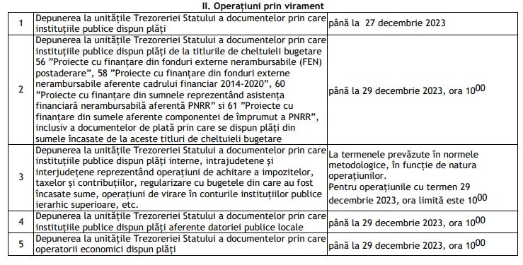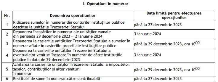Directia Generala Regionala a Finantelor Publice Galati aduce la cunostinta contribuabililor programul calendaristic pentru efectuarea operatiunilor in numerar si prin virament prin unitatile Trezoreriei Statului,conform prevederilor Anexei 1 la Normele metodologice privind incheierea exercitiului bugetar al anului 2023, aprobate prin Ordinul ministrului finantelor nr. 5.389/2023: