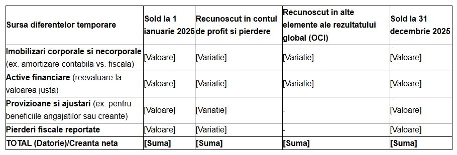 Acest model de tabel sintetizeaza miscarile diferentelor temporare pe parcursul exercitiului financiar 2025: